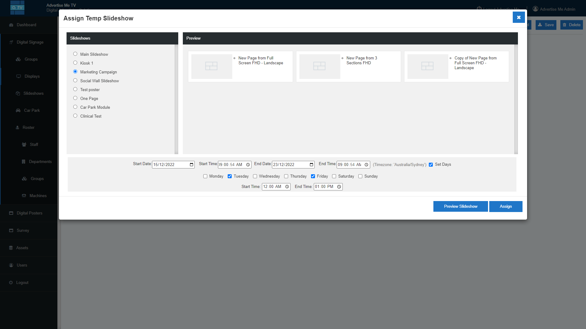 With our temp slideshow feature, you can use the software to schedule the slideshow ahead of time, so you won’t have to manually adjust each display every time you want to change an advertisement or announcement. For example, if you needed to display a marketing slideshow pre Christmas peak periods, between the 15th of December and 23rd of December on Tuesdays and Fridays from 12am-1pm then you can create a schedule similar to the below example: