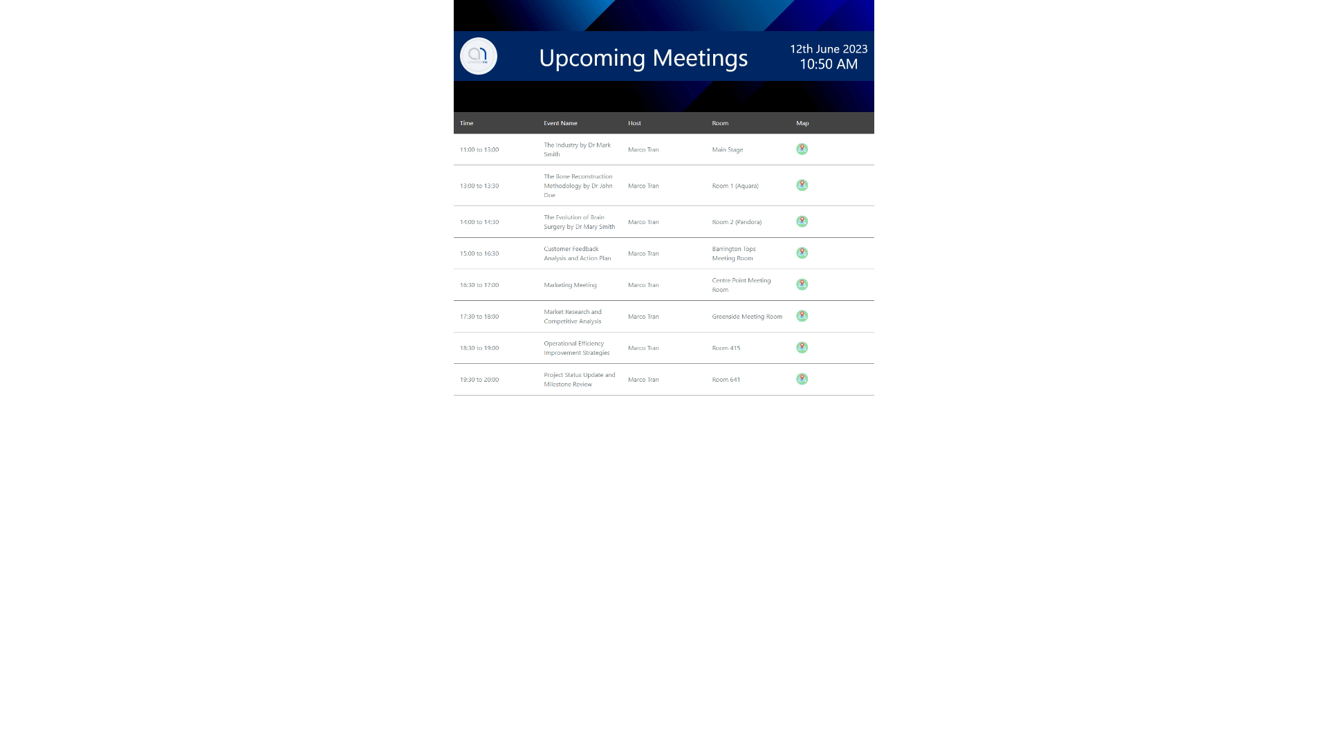 Smart Room and Event Board technology is changing the way digital signage is used at events, conference centres, meeting rooms and offices. It offers a simple yet powerful means to create an interactive display with multiple components like meeting room information, marketing information, directional wayfinding, news and events, and staff information all managed from one central software platform called AdvertiseMe.TV. Event planners can easily customise their displays while also keeping all content displayed in a consistent and professional way. By integrating with Office 365 calendars or event third-party systems such as EMS (Event Management Systems), you can take a hands-off approach and let the system automatically display real-time information.