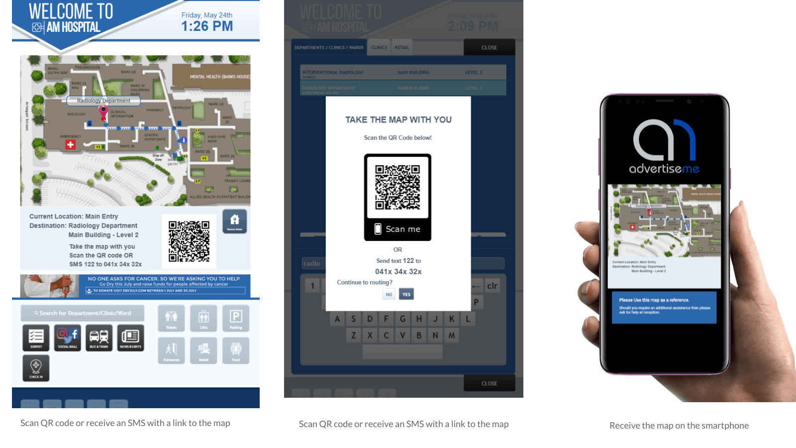 The digital wayfinding solution will display QR codes on the home or destinations screens for a thought-out solution. Once scanned, it can guide and redirect the customer to use the mobile version of the route