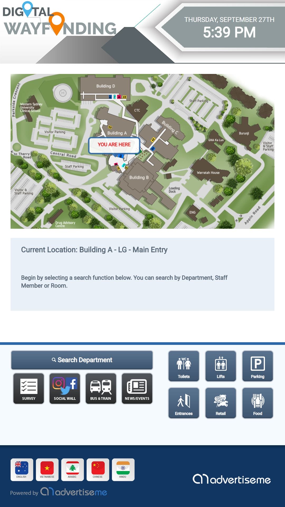 Integrating digital signage with digital surveys and QR codes provides the best experience and satisfaction for all of our clients and their visitors. It makes accessibility and sharing of information a straightforward endeavour that anyone will quickly adapt to. By introducing Digital Wayfinding, businesses and visitors will save on time, save energy and ultimately save money. The experience of getting lost in a shopping centre could be so detrimental for a shopper they may not even continue with their shopping – this is not a shopping experience any retailer or business wants. One of the ways our Digital Wayfinding Solution solves this is by generating QR codes on the digital screen that the customers can scan using their mobile phones. The mobile phone will then display their destination routes and they can follow this whilst they are walking in the building. We’ve made it so simple that they don’t need to spend time having to install a mobile app from Android Play or App Store. The digital maps we generate is characterised by directions, parking lots, names of rooms, floors, and elevator locations, amongst other features.